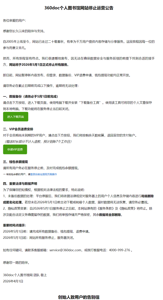 下午接到一条短信,说360doc个人图书馆要闭站了,登录一看,果然。